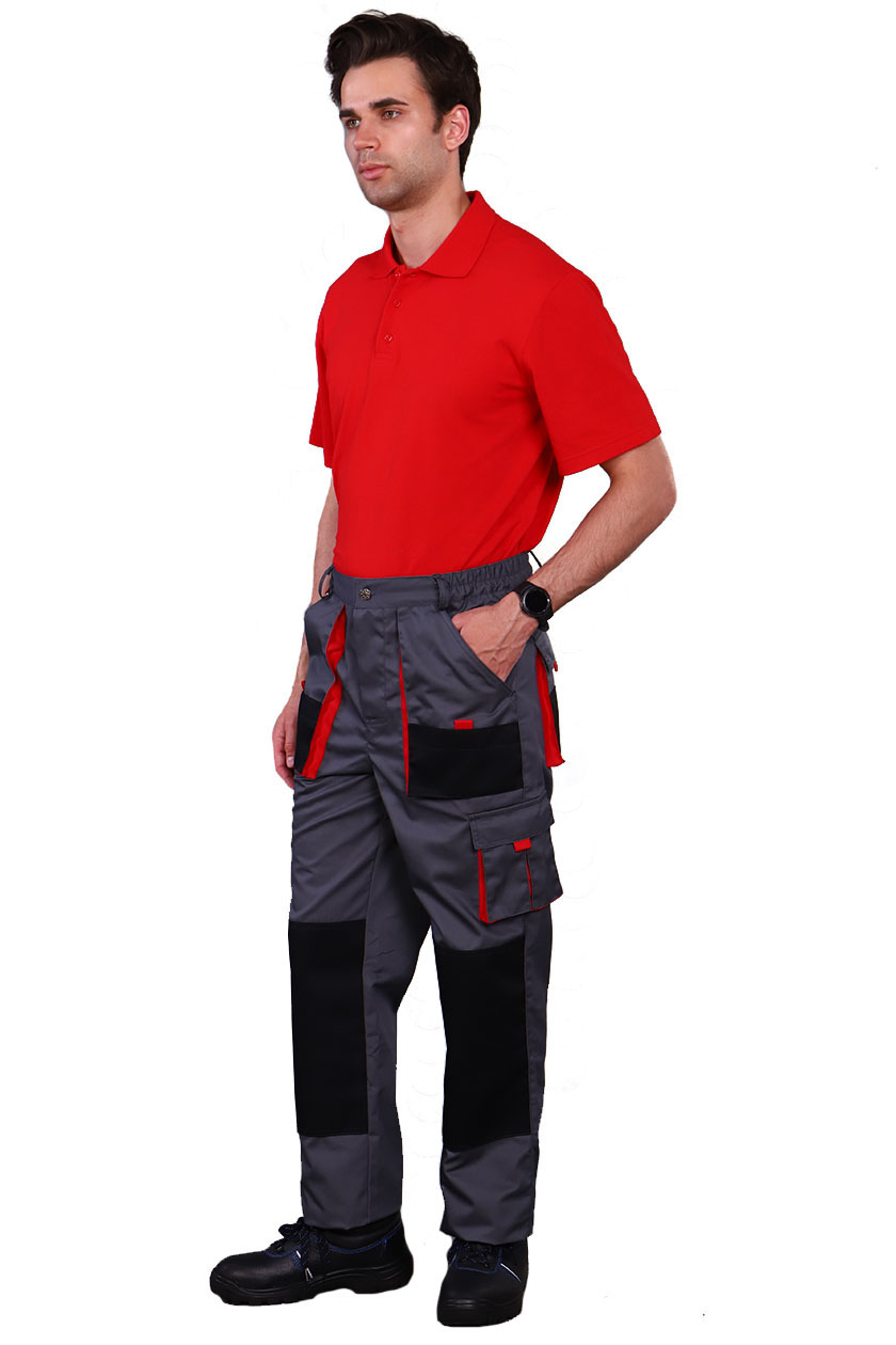 Брюки мужские с застежкой гульфика на тесьму «молния» и притачным поясом. Передние половинки брюк с двумя боковыми накладными объемными карманами с фигурным входом, с наколенниками. Наколенники со входом для амортизационных накладок.