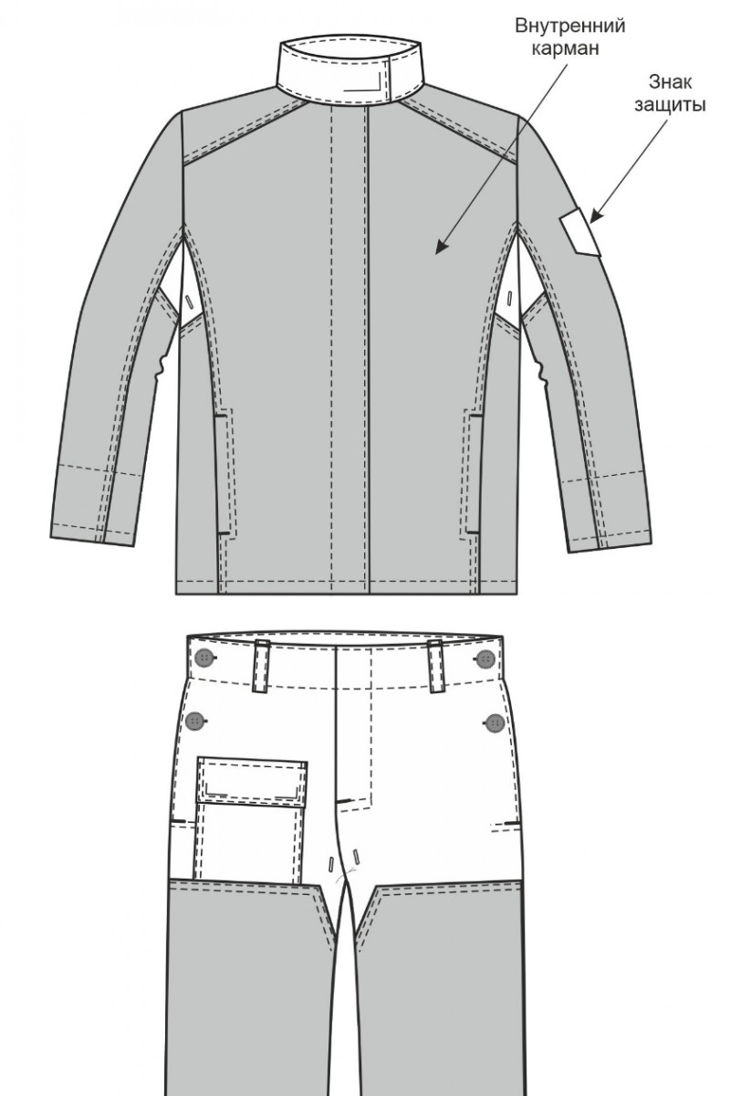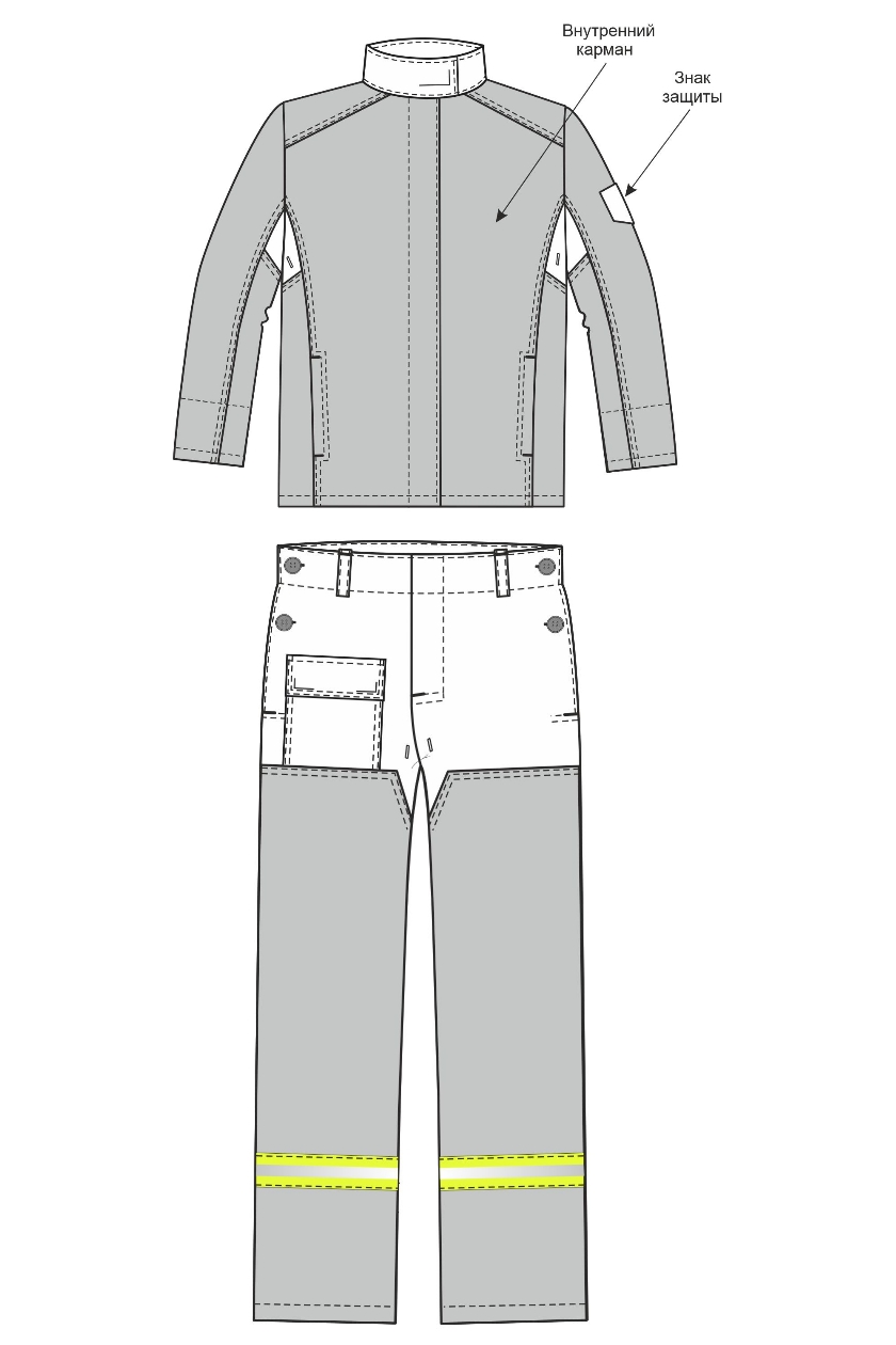 ➠ Брюки с притачным поясом, застежка гульфика на пуговицы. На правой передней половинке – накладной карман с клапаном. Передние половинки с усилительными накладками от линии бедра до низа с заходом на боковые швы. Брюки с бретелями. Нитки и фурнитура огнестойкие. По низу брюк расположен СОП 50 мм, огнестойкий.