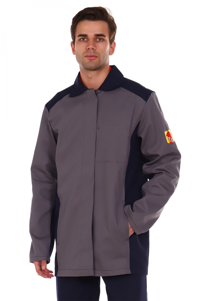 ➠ Куртка прямая с потайной застежкой на пуговицы. Полочки с рельефными швами, с боковыми вертикальными карманами. На левой полочке внутренний накладной карман. Спинка с вентиляционными отверстиями в швах притачивания кокетки. Рукава трехшовные. В верхней части боковых швов, под проймами обработаны вентиляционные отверстия. СОП 50 мм расположен по шву притачивания кокетки к спинке. СОП огнестойкий. Брюки с притачным поясом, застежка гульфика на пуговицы. На правой передней половинке – накладной карман с клапаном.